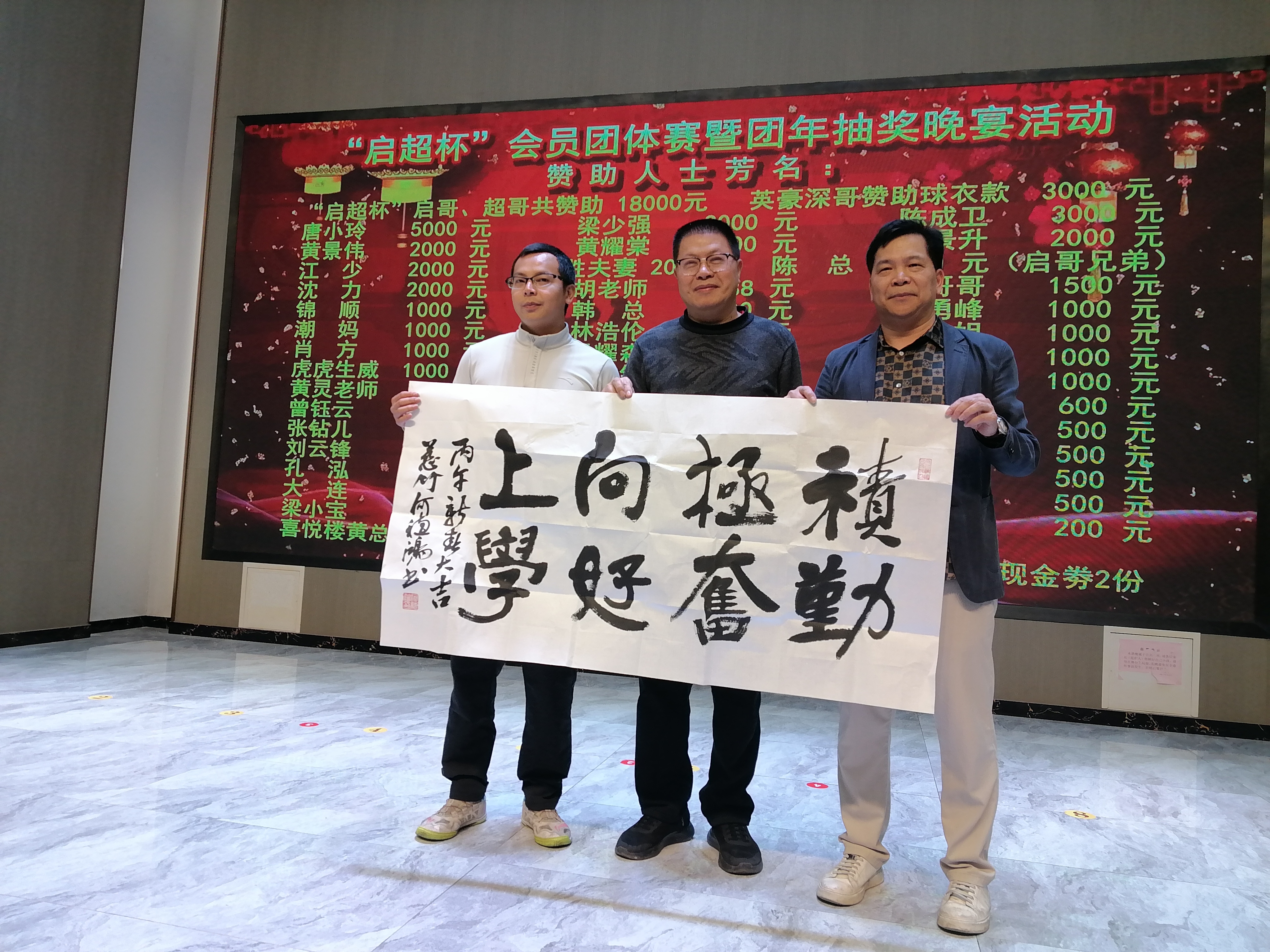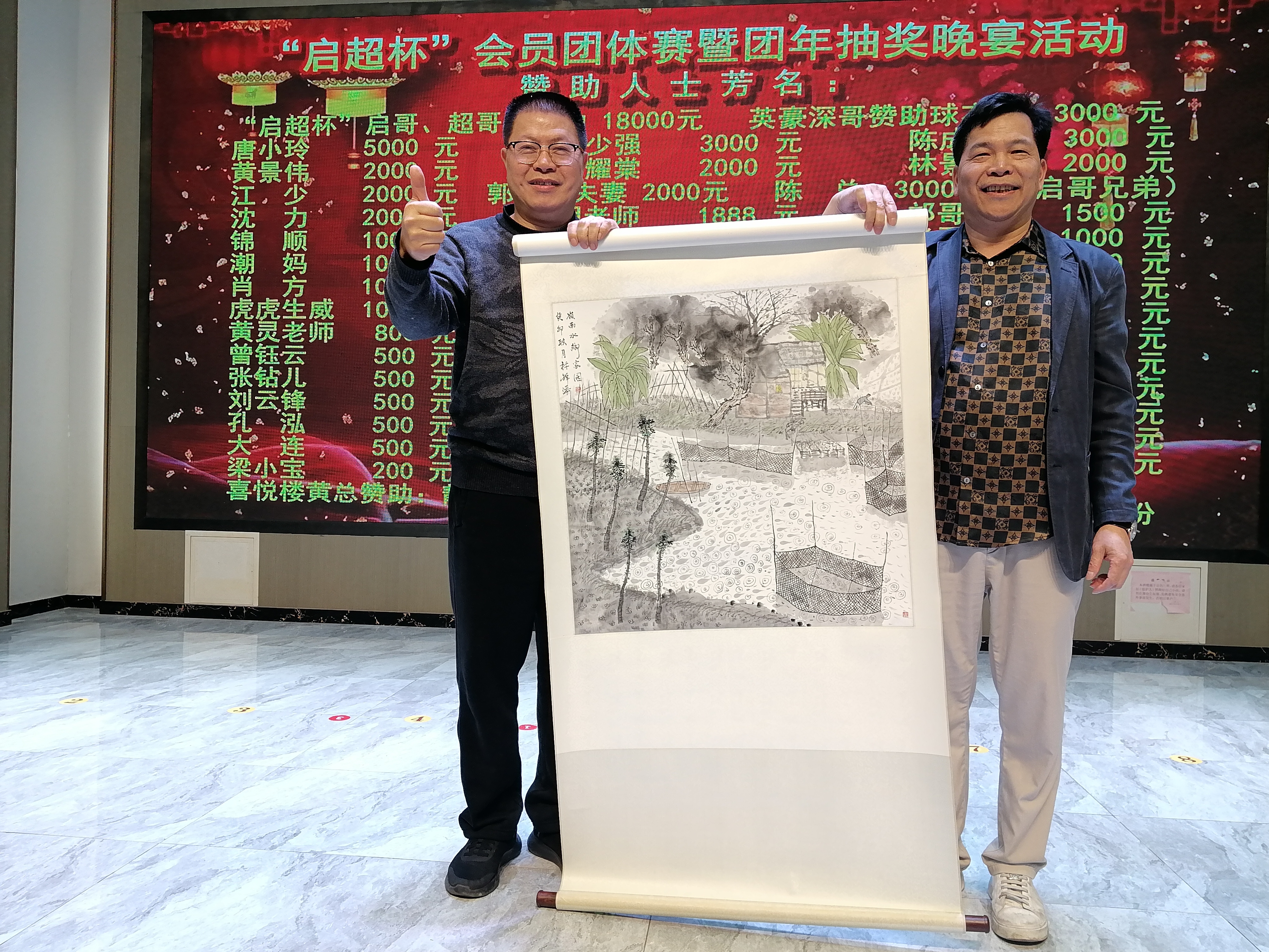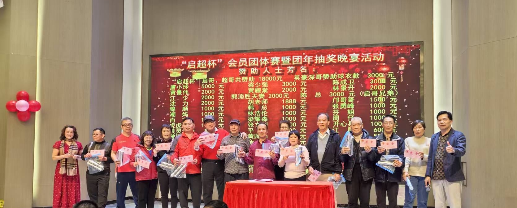 赛事落幕,温情延续。球会同步举办“启超杯”会员团体赛暨团年抽奖晚宴,现场暖意融融,会员们欢聚一堂共享佳肴,书画作品、现金券等丰厚奖品的抽奖环节让欢声笑语不断。现场展示的赞助人士芳名榜,向陈启成先生、何敏超先生的联合赞助,以及全体会员的鼎力支持致以谢意,让赛事不仅是技艺的竞技舞台,更成为凝聚球友情谊、增强社群归属感的温情纽带。